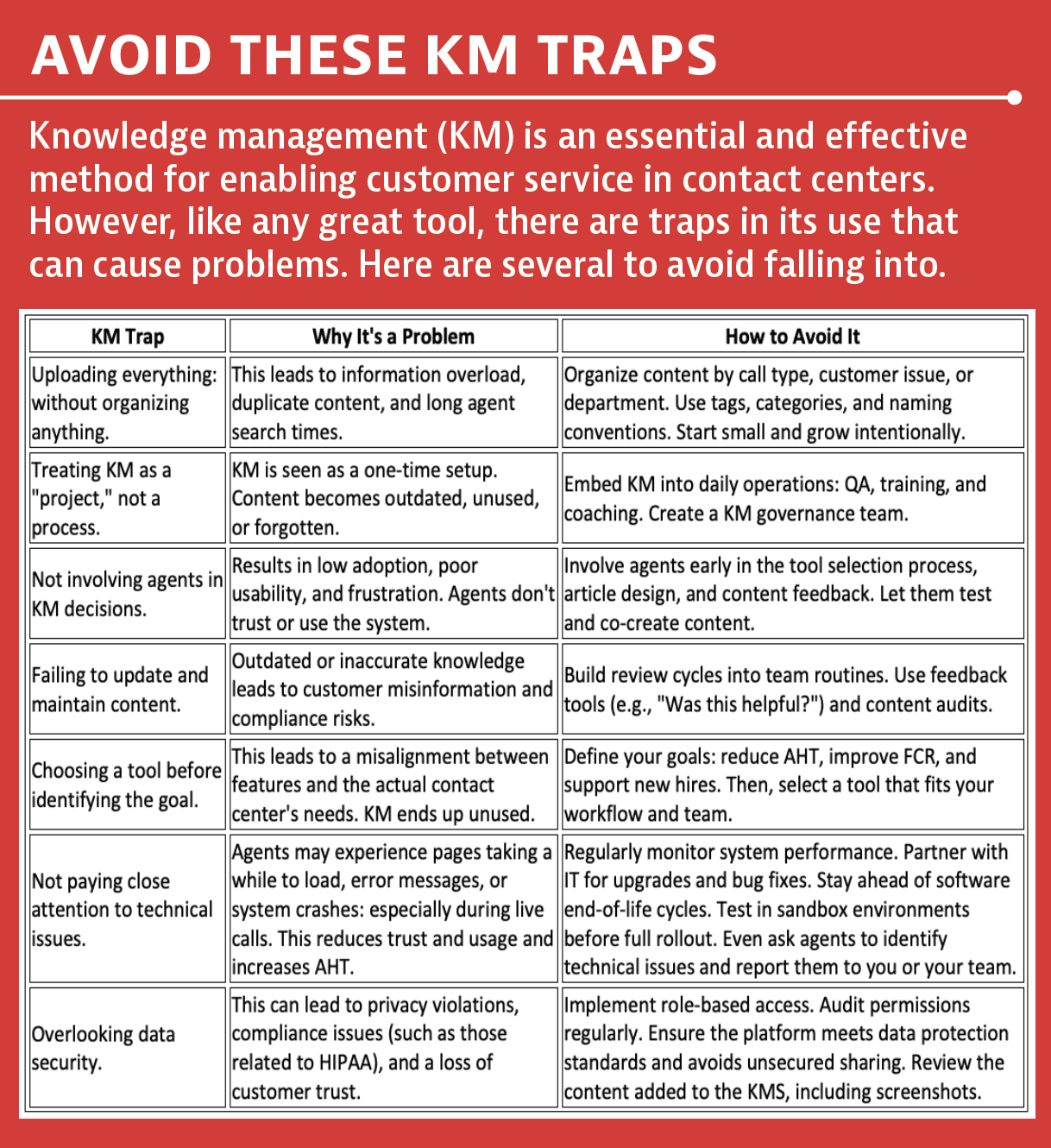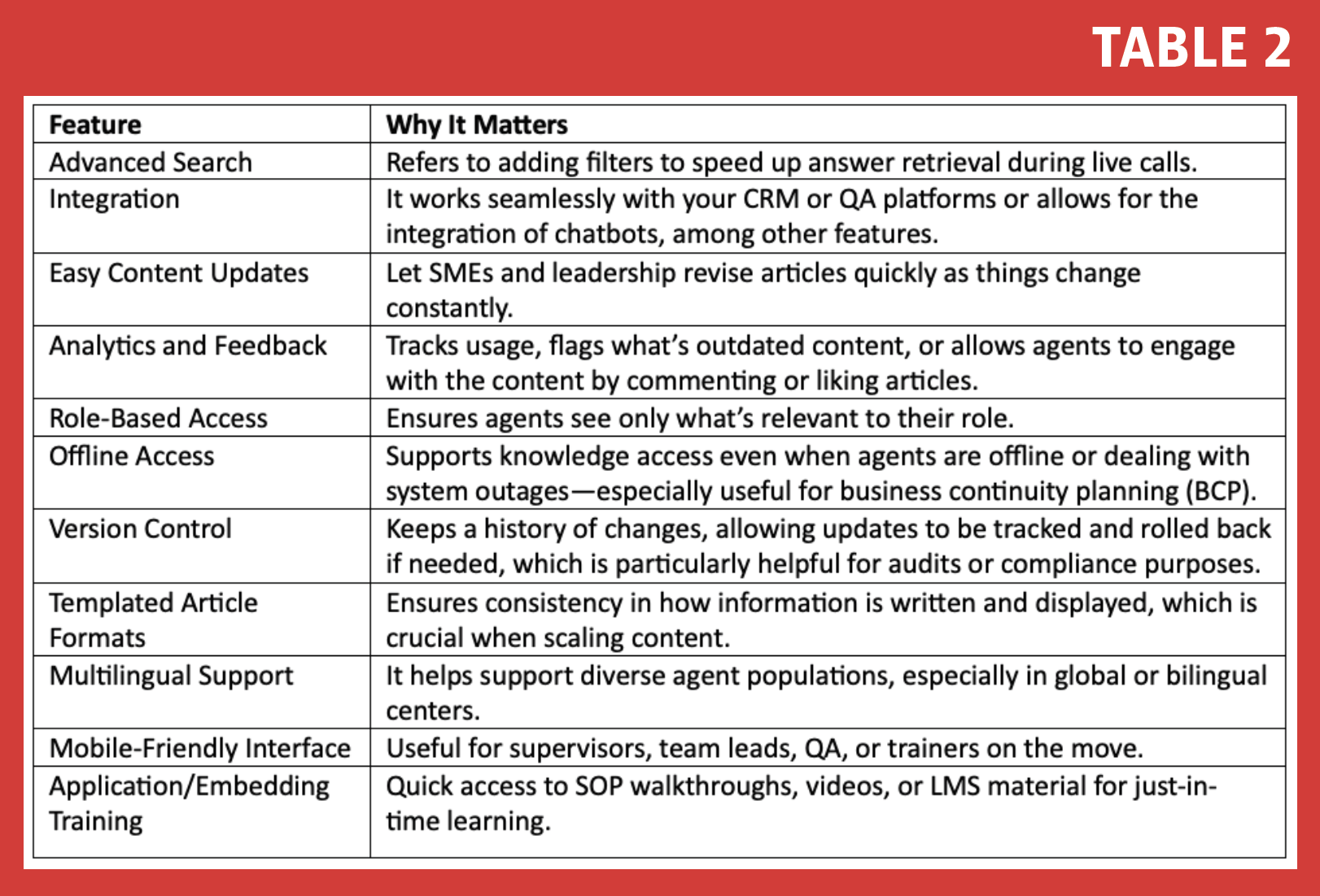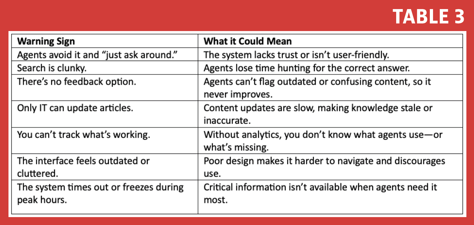 If your agents are ignoring your KMS or relying on sticky notes, email chains, or tribal knowledge, here are several red flags that could indicate whether it has a fixable problem orone that requires replacement (see Table 3). A KMS should support your team, not hinder them.