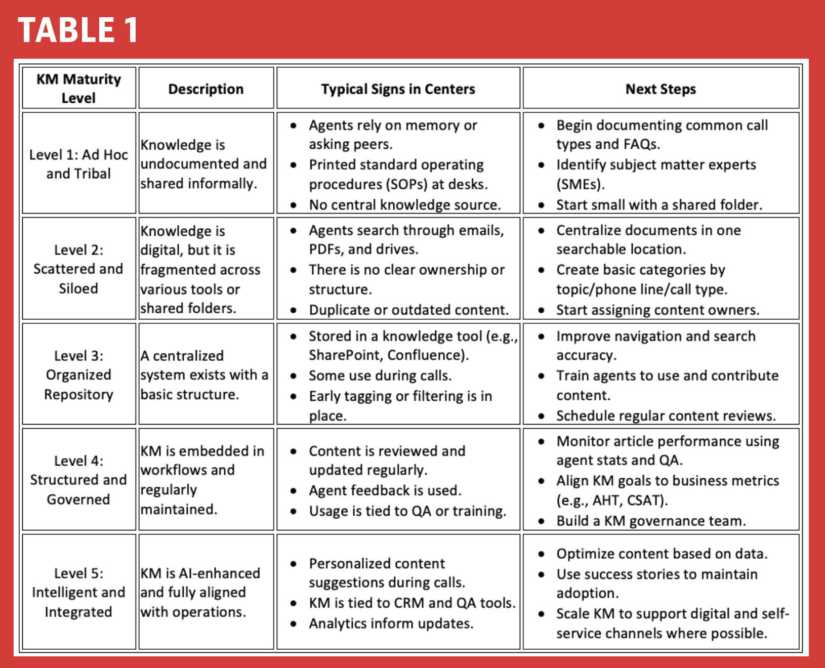 Table 1 (see following) provides a simple framework to assess where your call or contact center stands before implementing a KMS. You can use it to identify your current stage and what you need to focus on next.