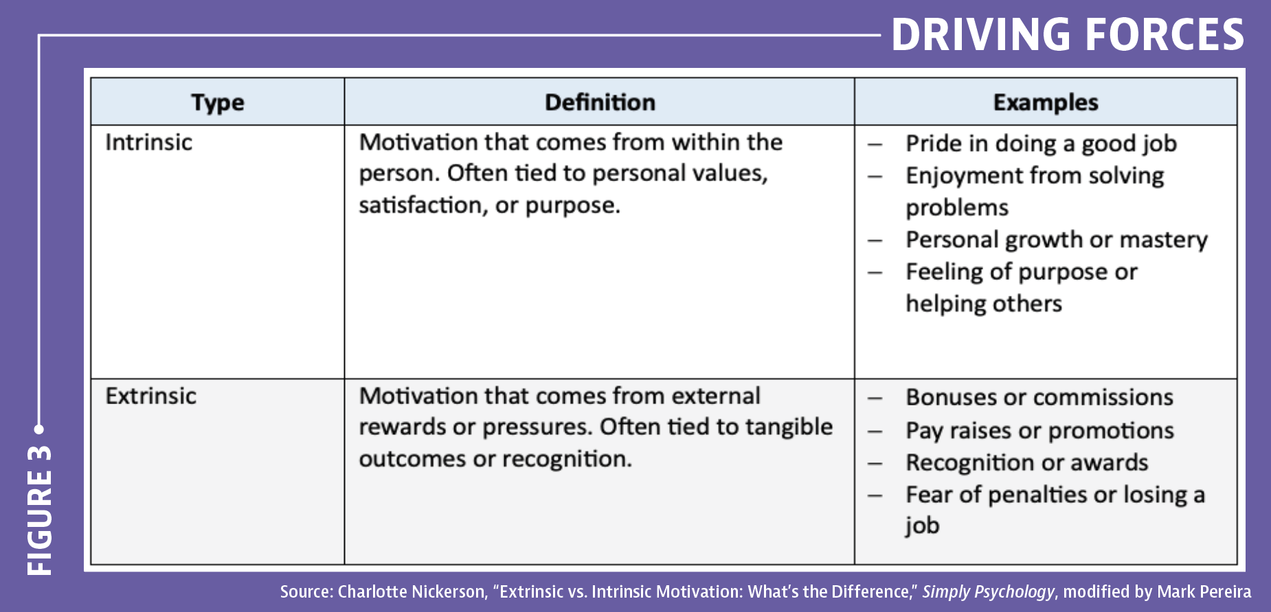 That’s where what I call “driving forces”, based on extrinsic and intrinsic motivation, described by Charlotte Nickerson, that I have modified for call and contact centers come in (see FIGURE 3).