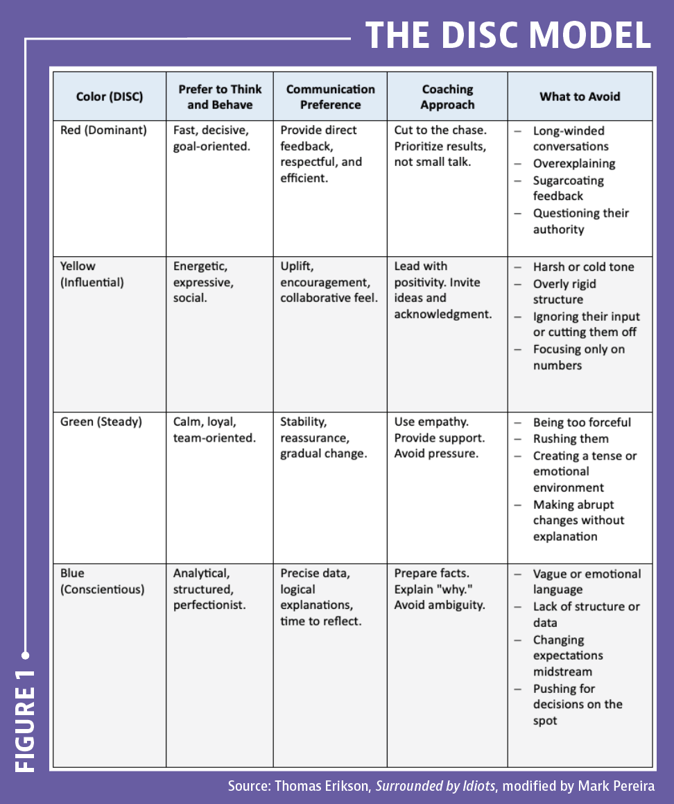 That’s where the DISC model comes in (see FIGURE 1). Or as Thomas Erikson colorfully puts it in the Surrounded by Idiots book series, it’s about understanding how people communicate based on four distinct behavior types: Red, Yellow, Green, and Blue.